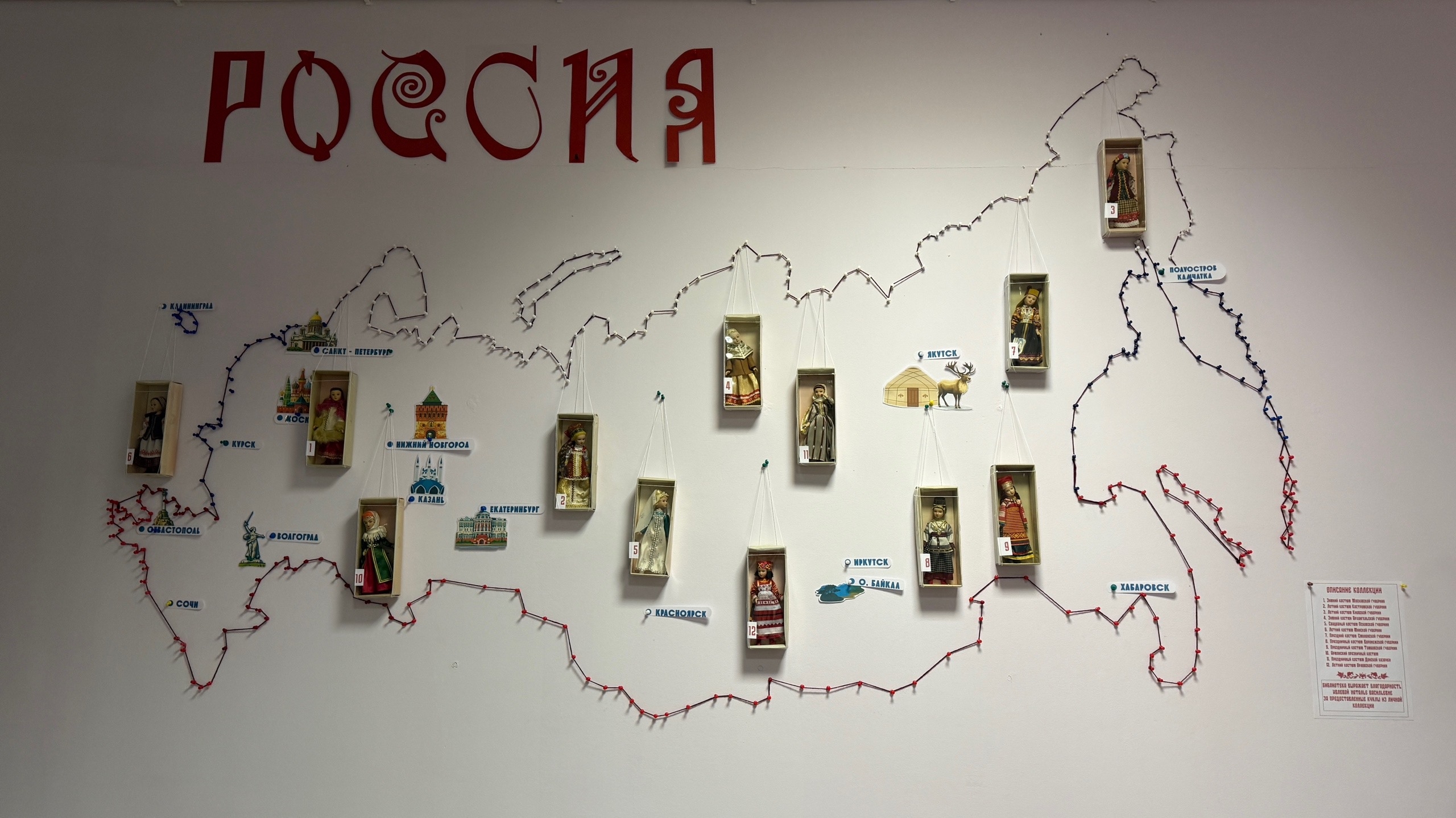 Сотрудники центральной библиотеки создали стилизованную карту России: они продумывали каждую деталь и бережно подбирали кукол в национальных костюмах, чтобы передать всё многообразие и красоту нашей страны.